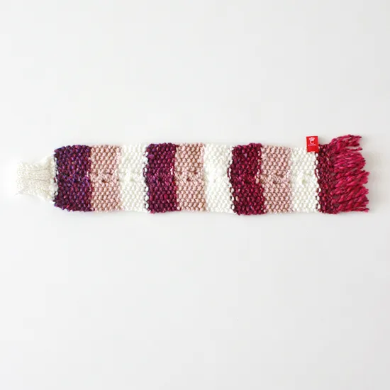 手編みの猫ちゃん用マフラーです。ウール100%の毛糸で一目一目丁寧に編みました。片側が輪っかになっていますので反対側を通して着用してくださいアイボリー×赤紫系ミックス×くすみピンクのボーダーです。1点ものになります。