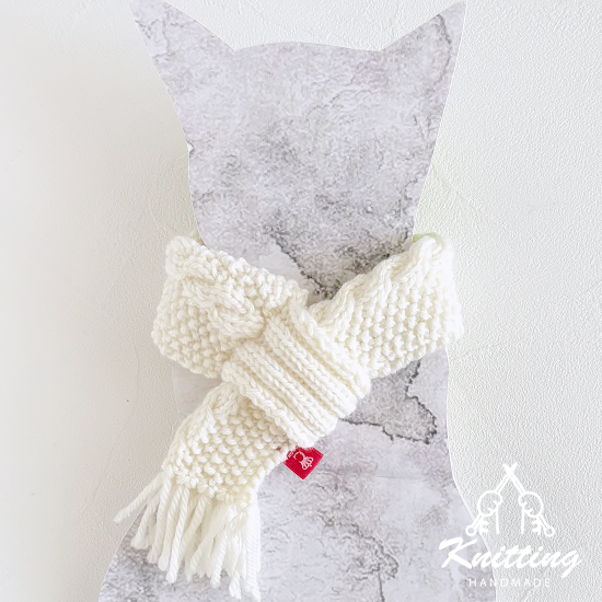 手編みの猫ちゃん用マフラーです。ウール100%の毛糸で一目一目丁寧に編みました。片側が輪っかになっていますので反対側を通して着用してください。色はホワイトです。