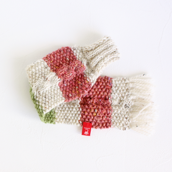 手編みの猫ちゃん用マフラーです。ウール100%の毛糸で一目一目丁寧に編みました。片側が輪っかになっていますので反対側を通して着用してください。ツィードネップ×ピンクミックス×グリーンのボーダーです。