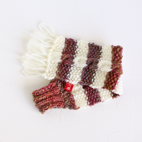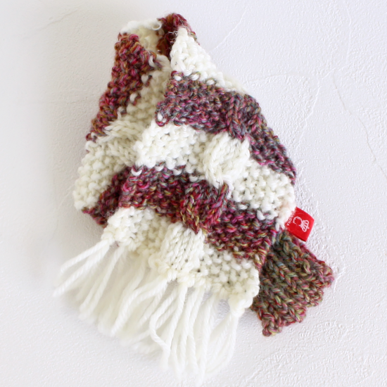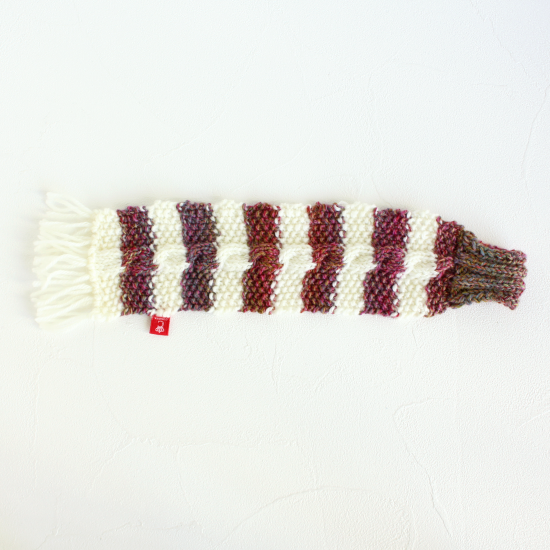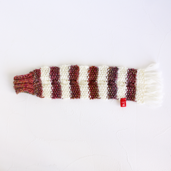 手編みの猫ちゃん用マフラーです。ウール100%の毛糸で一目一目丁寧に編みました。片側が輪っかになっていますので反対側を通して着用してください。バーガンディミックス×ホワイトのボーダーです。