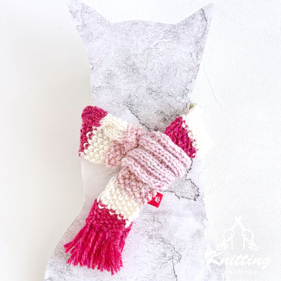 手編みの猫ちゃん用マフラーです。ウール100%の毛糸で一目一目丁寧に編みました。片側が輪っかになっていますので反対側を通して着用してください。淡ピンクミックス×ホワイト×ベリーピンクミックスのボーダーです。