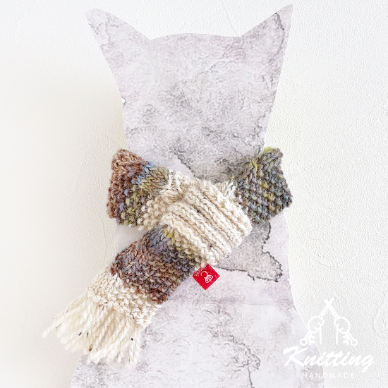 手編みの猫ちゃん用マフラーです。ウール100%の毛糸で一目一目丁寧に編みました。片側が輪っかになっていますので反対側を通して着用してください。ツィードネップ×ブラウンミックスのボーダーです。