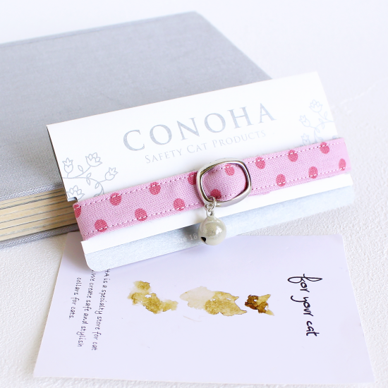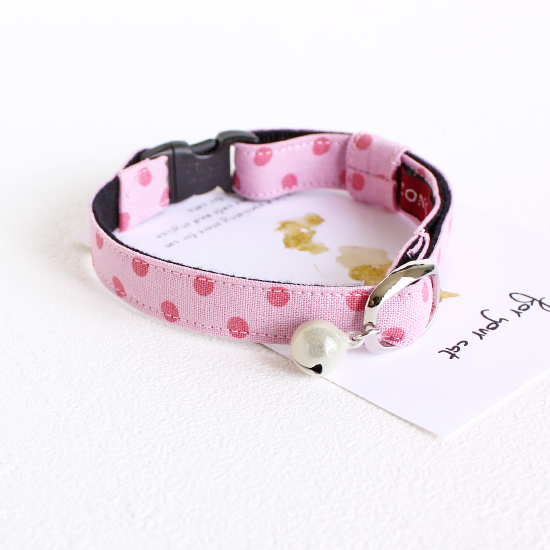 ピンク×濃いピンクの女子力高めな水玉模様です。パールホワイトの鈴がよく似合いますので鈴が大丈夫な猫ちゃんはぜひ鈴付きで。