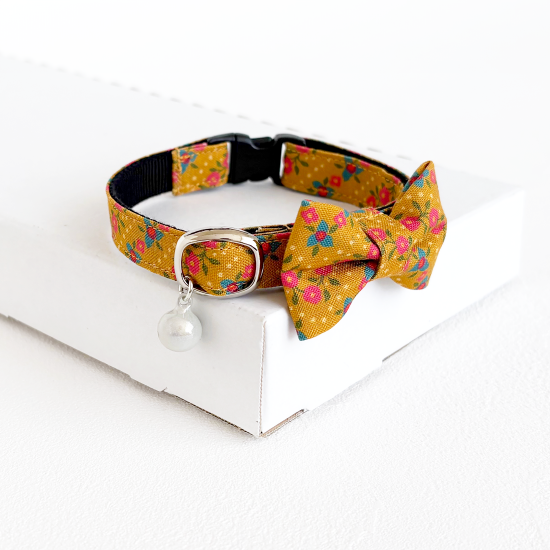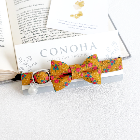 スタード色をベースに鮮やかなピンクと水色の花柄模様です。レトロポップなカラーリングで大人可愛い首輪です。