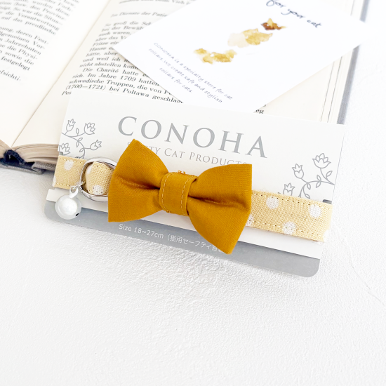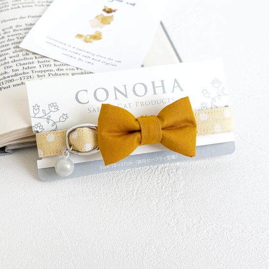 優しい色合いのカスタードクリームドット柄に無地のマスタード色のリボンをつけました。