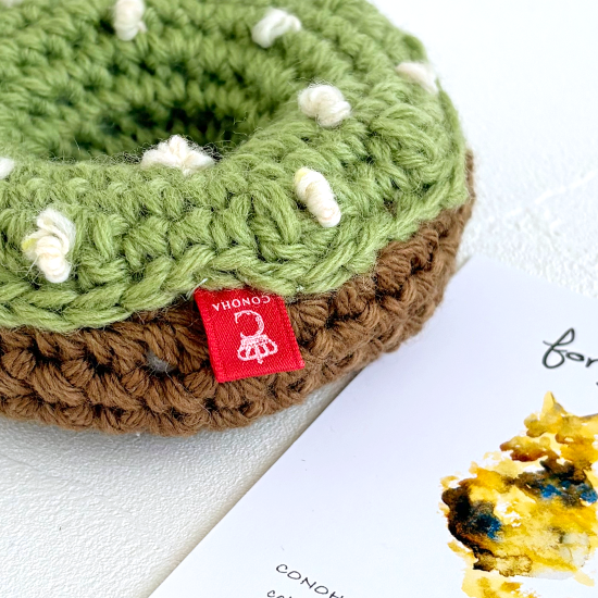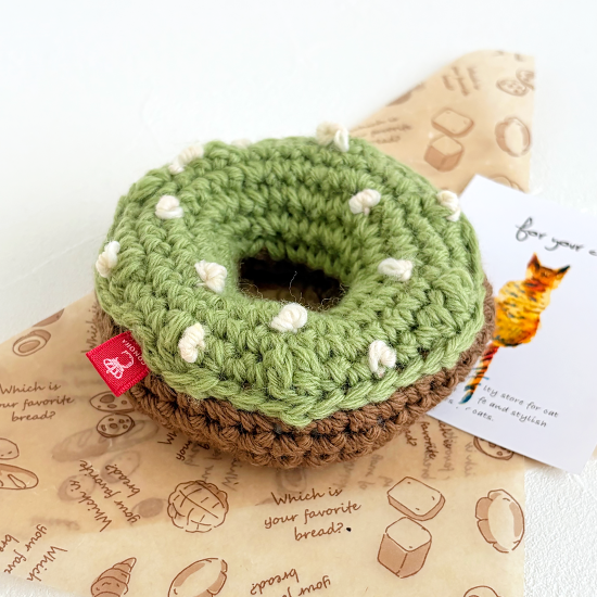 チョコ生地に抹茶チョコをとろりとかけ、ホワイトチョコチップをちりばめた美味しそうなデザインです。見た目もかわいらしく、遊んで飾って楽しい猫用おもちゃです。