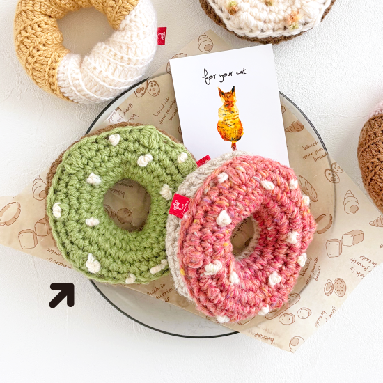 1つずつ丁寧に編み上げたドーナツの中には綿がたっぷりと詰まっており、猫ちゃんが抱えたり、転がしたり、ケリケリしたりして楽しめます。