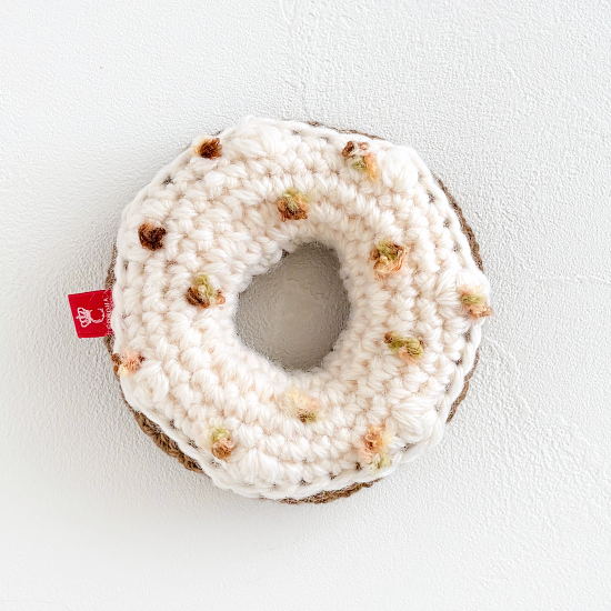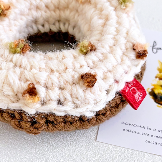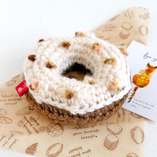 チョコ生地にホワイトチョコをとろりとかけ、ピスタチオチョコチップをちらした美味しそうなデザインです。見た目もかわいらしく、遊んで飾って楽しい猫用おもちゃです。