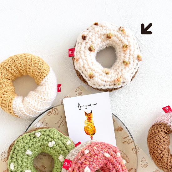 1つずつ丁寧に編み上げたドーナツの中には綿がたっぷりと詰まっており、猫ちゃんが抱えたり、転がしたり、ケリケリしたりして楽しめます。