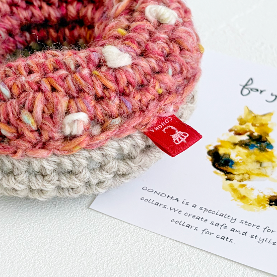 プレーン生地にストロベリーチョコをとろりとかけ、ホワイトチョコチップをちらした美味しそうなデザインです。ピンクの毛糸はカラーミックス毛糸を使用しています。見た目もかわいらしく、遊んで飾って楽しい猫用おもちゃです。