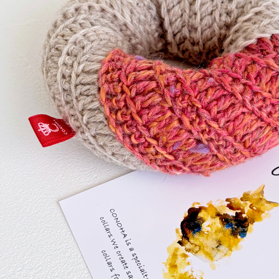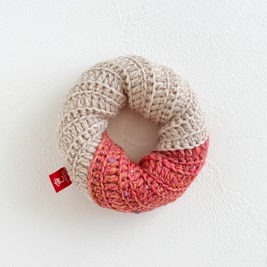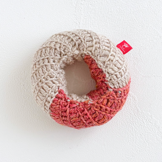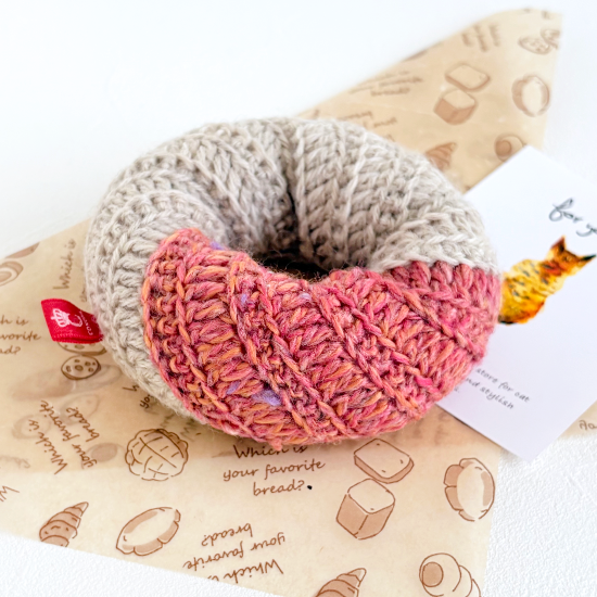 プレーン生地にストロベリーチョコをとろりとかけた、美味しそうなフレンチクルーラーです。ピンクの毛糸はカラーミックス毛糸を使用しています。見た目もかわいらしく、遊んで飾って楽しい猫用おもちゃです。