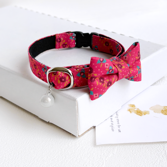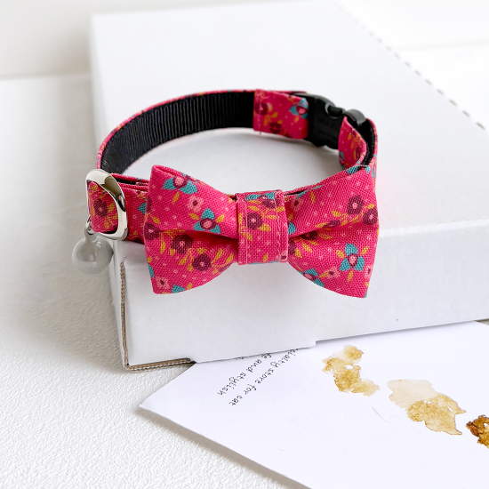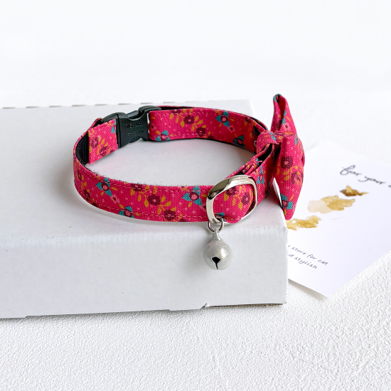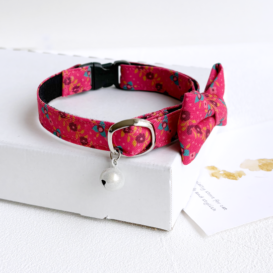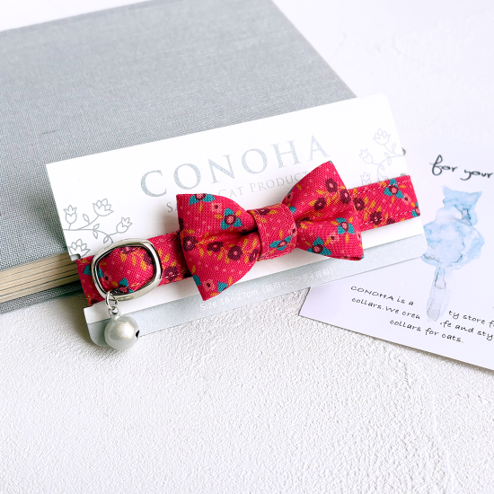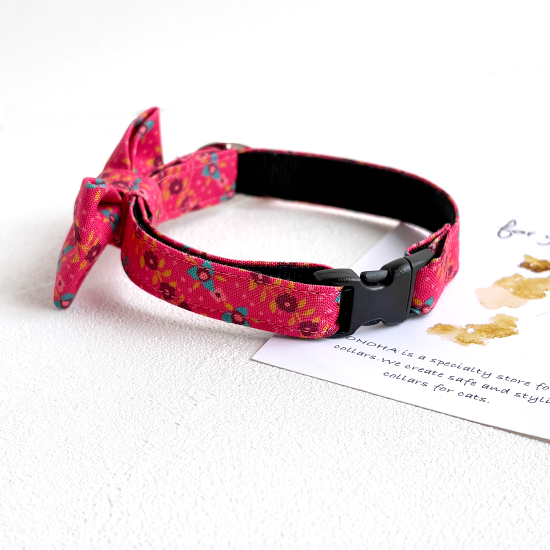 鮮やかなピンク色ベースの花柄模様です。レトロポップなカラーリングで大人可愛い首輪です。