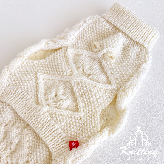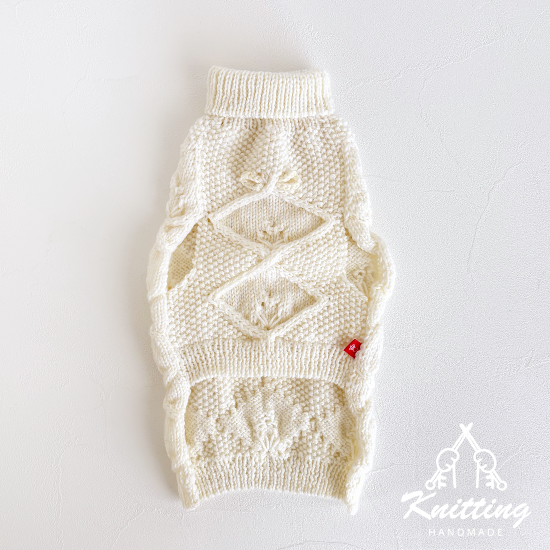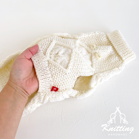 ◯サイズ:フリーサイズ 標準サイズ(3〜5キロくらい)の成猫用です。モデル猫(オス)は4.3キロです。 ※こちらの白いセーターは「アラン模様(白)」です。色柄が違いますのでサイズ確認用としてご覧ください。 《平置きサイズ》首まわり:10cm 胴回り:21cm 着丈:37cm